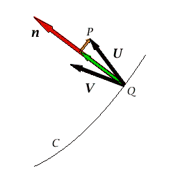 Figure 1 The curve C, the points P and Q, and the vectors U, n (red), (green) and (gold)