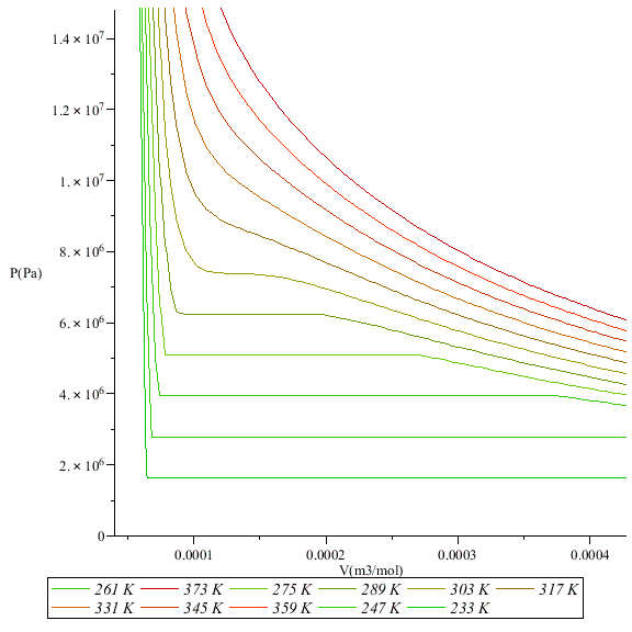 isothermsW:=proc(a::positive,b::positive,DT::positive,n::posint) local TC,PC,P,T,V,i,plo,pl,R: description "This procedure plots the n+1 isotherms of van der Waals in a range of DT around the critical temperature and of the gas described by the constants (a,b) in SI units": uses plots: pl:=printlevel: printlevel:=0: R:=8.31447: TC:=8*a/(27*R*b): PC:=a/(27*b^2): T[0]:=TC-DT/2: if T[0]<0 then error "Invalid DT: %1" end if; if n<1 then error "Invalid n: %1" end if; P:=(V,T)->R*T/(V-b)-a/V^2: for i from 0 to n do T[i]:=T[0]+i*DT/n: plo[i]:=plot(P(V,T[i]),V=1.1*b..10*b,color=COLOR(RGB,i/n,1-i/n,1),legend=cat(trunc(T[i])," K"),view=[b..10*b, 0..2*PC]): end do: printlevel:=pl: display({seq(plo[i],i=0..n)},labels=["V(m3/mol)","P(Pa)"]); end proc:
