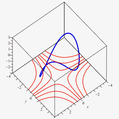 Rote la figura y observe detenidamente cómo se relacionan las curvas de nivel (curva azul) y la curva de intersección (la curva roja), especialmente en los casos y . Para estos dos últimos casos, rote la figura de tal forma que el eje apunte perpendicularmente hacia usted. Compare sus observaciones con el mapa de curvas de nivel que se muestra abajo : Sugerencia: Haga clic sobre la figura de arriba, y esto activará una barra de herramientas como el que se indica a continuación: Ajuste los valores de los ángulos a los indicados en la imagen anterior con lo que podrá realizar mejor sus comparaciones.