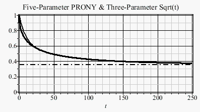 p[2]:=plot(r(t),t=0..250,0..1,co=black,th=3,                     title="Five-Parameter PRONY & Three-Parameter Sqrt(t)"):