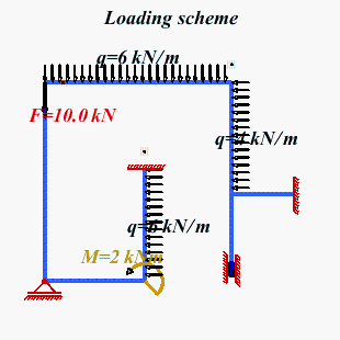 The application allows you to determine the constraint reactions, build diagrams of the normal forces N, shear forces Q and bending moments M for beams and frames with any number of sections and degree of static indefinability. Reactions identified by a capital letter X. Indexes of reactions, chosen arbitrarily, but you should set the reactions X[1], X[2] and X[3] so that the structure has been kinematically unchanged. The application calculates the deformation (displacements) of the structure in millimeters and displays the displacements of nodes in the horizontal and vertical. It is also possible to calculate the displacement of any point of the structure. In the program has the ability to set the stiffness of each section frame (beams) EI[i]