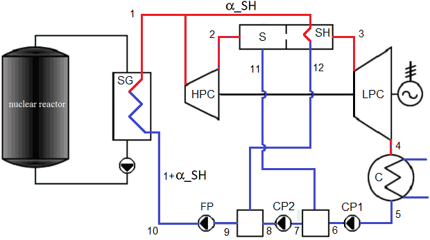 Pressurized water flows from the nuclear reactor (NPP primary circuit) to the steam generator (SG) and transfers heat to the boiling water of the second circuit. Saturated steam is supplied from the steam generator to the high pressure cylinder (HPC) of the steam turbine. Part of the live steam from the steam generator enters the superheater. Before being superheated, the exhaust steam from the HPC is partially dried in the separator (S), where some water is separated from the wet steam, and then returned to the circuit with bypass of the low pressure cylinder (LPC) of the steam turbine.