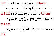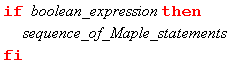 The part of the if-then-else-fi statement between the if and the then is called the conditional-part and it is either true or false. If the conditional-part is true, then Maple executes the statements between the then and the else . These statements are called the body of the then-part . If the conditional-part is false, then the Maple executes the statements between the else and the fi . These statements are called the body of the else-part . The bodies of either the then or else part can contain any number of Maple commands. The body of the else-part is optional and if it is left off, then the conditional statement has the following simpler form, which is referred to as an if-statement .