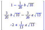 `+`(`*`(`^`(`+`(2, `-`(`*`(`/`(1, 10), `*`(b, `*`(`^`(10, `/`(1, 2))))))), 2)), `*`(`^`(`+`(`*`(`/`(3, 10), `*`(b, `*`(`^`(10, `/`(1, 2))))), `-`(`*`(`/`(3, 13), `*`(a, `*`(`^`(13, `/`(1, 2))))))), 2)...