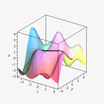 In Figure 3 where we graph the solution of the Euler-Lagrange equations on the surface from Figure 1, we take the precaution of adding to each -coordinate along the curve so that it can be seen more clearly. The alternative would have been to make the surface sufficiently transparent that the curve, lying in the surface, would be visible.