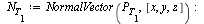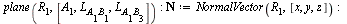 The normal to the plane containing these two edges is found by first defining this plane, then using the NormalVector command from the geom3d package.