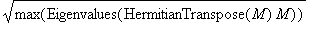 > OpNorm:=proc(M::Matrix) #DECLARE LOCAL VARIABLES local Dim,S,W,i,j,E,N; #DIMENSION OF M*M WILL BE COLUMNDIMENSION(M) Dim:=ColumnDimension(M); #SET S TO M*M S:=Matrix(1..Dim,1..Dim,shape=hermitian); W:=evalf(Multiply(HermitianTranspose(M),M)); for i from 1 to Dim do S[i,i]:=Re(W[i,i]) od; for i from 1 to Dim do for j from i+1 to Dim do S[i,j]:=W[i,j]; od; od; #GET OPERATOR NORM = SQRT(MAX(EIGENVALUES(S)) E:=Eigenvalues(S); N:=max(seq(E[i],i=1..Dim)); #ALL E-VALUES OF S SHOULD BE NON-NONGETATIVE #GUARD AGAINST ERRORS if N < 0 then error "Operator Norm could not be calculated" else RETURN(sqrt(N)) fi; end proc: