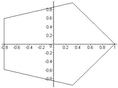 for j = 1.. n , where = . The largest eigenvalue of L[ ] represents the largest real part of any number in the rotated numerical range W( M ). For each j from 1 to n , Maple draws a vertical line segment through the largest eigenvalue of L[ ] and then rotates the segment by to its appropriate position. Every point in W( M ) will either lie on the rotated segment or to one side of it. The result is a picture of the numerical range bounded by n support lines. The larger the value of n , the more accurate the representation of the numerical range.
