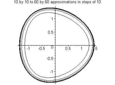 > for i from 1 to 6 do P[i]:=W(SubMatrix(M,1..i*10,1..i*10)): od: display(seq(P[i],i=1..6),scaling=constrained,title=`10 by 10 to 60 by 60 approximations in steps of 10`);