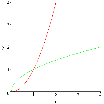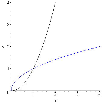 >    plot([f,g,x], x= 0..4, y= 0..4