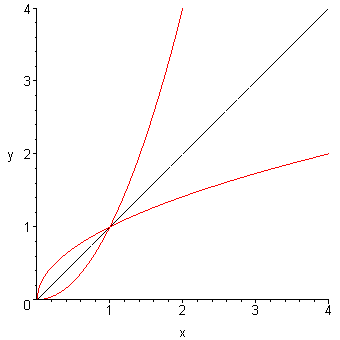 >    plot([f,g,x], x= 0..4, y= 0..4, scaling= constrained, color= [red, red, black]);