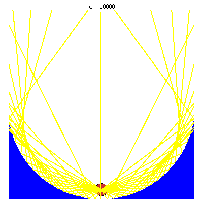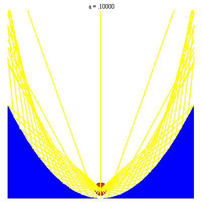 Parabolas were born to reflect. In the simulation below, the red ball is the light bulb, and the blue region is a cross-section of the reflecting surface. The yellow lines are light beams. (Only the reflected beams are shown; beams that miss the surface are not shown.) To move the bulb, click on the graphic and drag the slider in the animation toolbar. Try setting the bulb distance to .24694, which is the approximate focal distance of the parabola . At this distance, the reflected beams are in perfect focus.