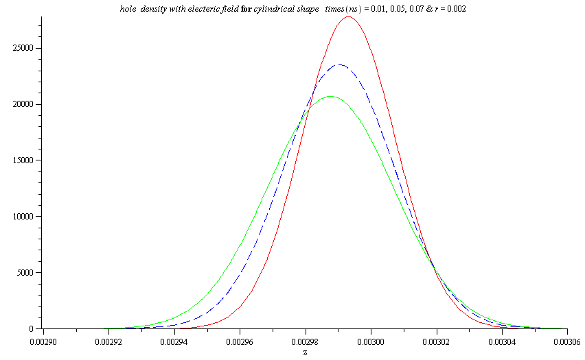 Now we can plot the density of electrons and holes for various time and electric field for CdZnTe semiconductor material: