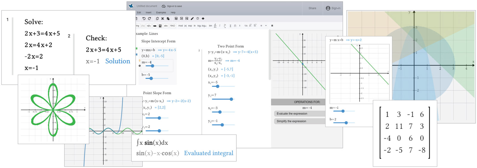 Maple Learn is the latest member in the Maplesoft product family. Maplesoft’s flagship product, Maple, combines the world’s most powerful mathematics engine with an easy-to-use interface, a sophisticated programming language, education-specific features, and extensive connectivity and documentation tools. Students who initially use Maple Learn, with its exclusive focus on teaching and learning, will be able to transition to Maple if and when their needs grow. Complementary to both products is the free Maple Calculator App, which allows students to graph and solve problems on their phone, but also to move those problems into Maple or Maple Learn for deeper investigation.