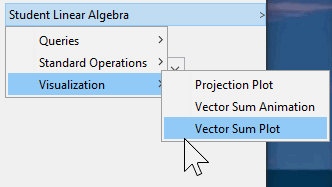 Many visualizations have been added to the Student:-LinearAlgebra context panel, including CrossProductPlot, EigenPlot, LeastSquaresPlot, LinearSystemPlot, LinearTransformPlot, PlanePlot, ProjectionPlot, and VectorSumPlot (plot or animation).