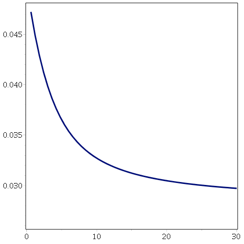 PseqStatisticsLineChartDiscountBondPriceM,S1,i,T,output=zerorate,xcoords=T,axes=BOXED,thickness=3,markers=false,i=1..51: