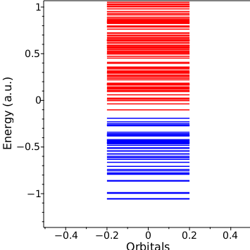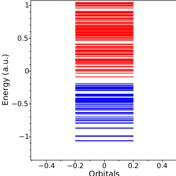 The energies of the molecular orbitals can be plotted with the blue levels corresponding to occupied orbitals and the red levels corresponding to unoccupied orbitals