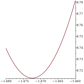 However, this is still a severe overestimation of the radius: the minimal value on this interval is about 8.713 and the maximal value of about 8.781 is achieved at x=−1.46. We verify these values numerically and graphically below.