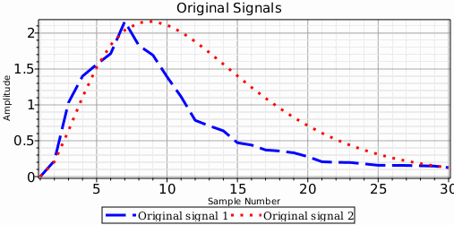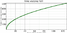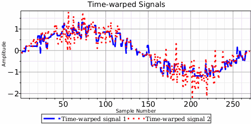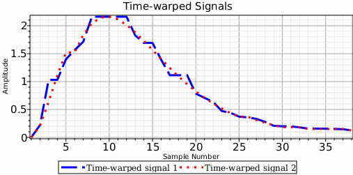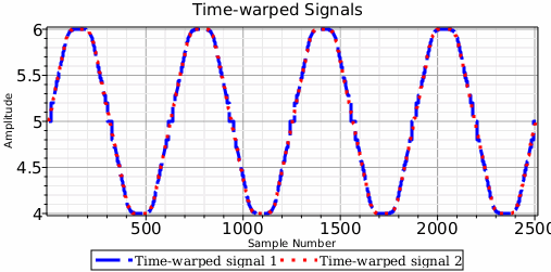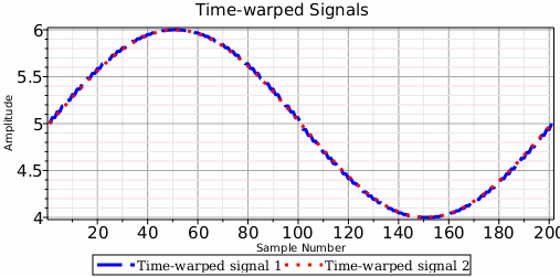 To match signals, the DynamicTimeWarping command inserts zero or more successive copies of every sample for each signal in such a way that the time-warped signals have the same length and the error between them (as measured by metric) is as small as possible. Note that if two signals are identical except for the number of copies of successive samples, then they can be matched exactly. More precisely, the command "warps" X into U and Y into V by computing Vectors of indices G and H, both of the same length k which satisfy G1=1, Gk=m, H1=1, Hk=n, and Gi+1Gi0,1 and Hi+1Hi0,1 for each i.