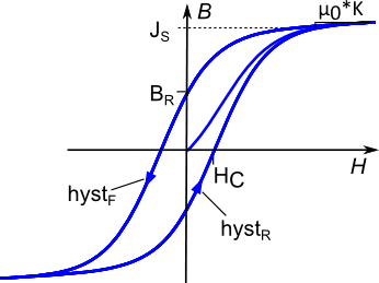 The Tellinen Soft component is a flux tube element of fixed length and cross-sectional area for modeling soft magnetic materials with ferromagnetic and dynamic hysteresis (eddy currents). The ferromagnetic hysteresis behavior is defined by the Tellinen hysteresis model. The shape of the limiting hysteresis loop (see Fig. 1) is described by simple hyperbolic tangent functions with four parameters. The hysteresis shape is limited but the parameterization of the model is simple and the model is relatively fast and robust. The rising (hystR) and falling (hystF) branches of the limiting hysteresis loop are defined by the following equations: