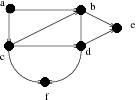 This diagram represents a graph with vertex set V=a,b,c,d,e,f, and edge set E=a,b,a,c,b,d,b,e,c,b,c,d,c,f,d,e,f,d.
