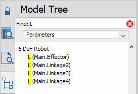 The Parameters view of the Model Tree lets you search for parameters that you have defined in any of the following: