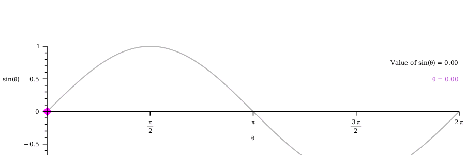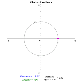 Explore by rotating the hypotenuse about the circle's center. By calculating the ratio opposite/hypotenuse for different values of θ, you can construct the graph of sinθ. Change the value of r with the slider and notice that this ratio is not affected.