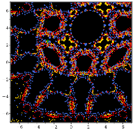 The following application allows you to explore the Hopalong by varying the parameters a, b, and c as well as n (the number of iterations), the symbol size of the iterates, and the background color choice. You can also change the starting values x1, y1 of each of the three orbits by dragging the handles (which are solid green diamonds by default).