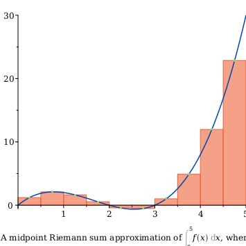 RiemannSumxx2x3,x=0..5,method=midpoint,output=plot