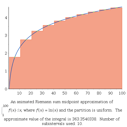 RiemannSumlnx,x=1..100,method=midpoint,outline=true,output=animation