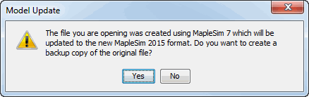 When you first save a model created with a previous version of MapleSim in MapleSim 2015, the Model Update dialog box appears. This dialog box asks whether or not you want to create a backup copy of the original file.
